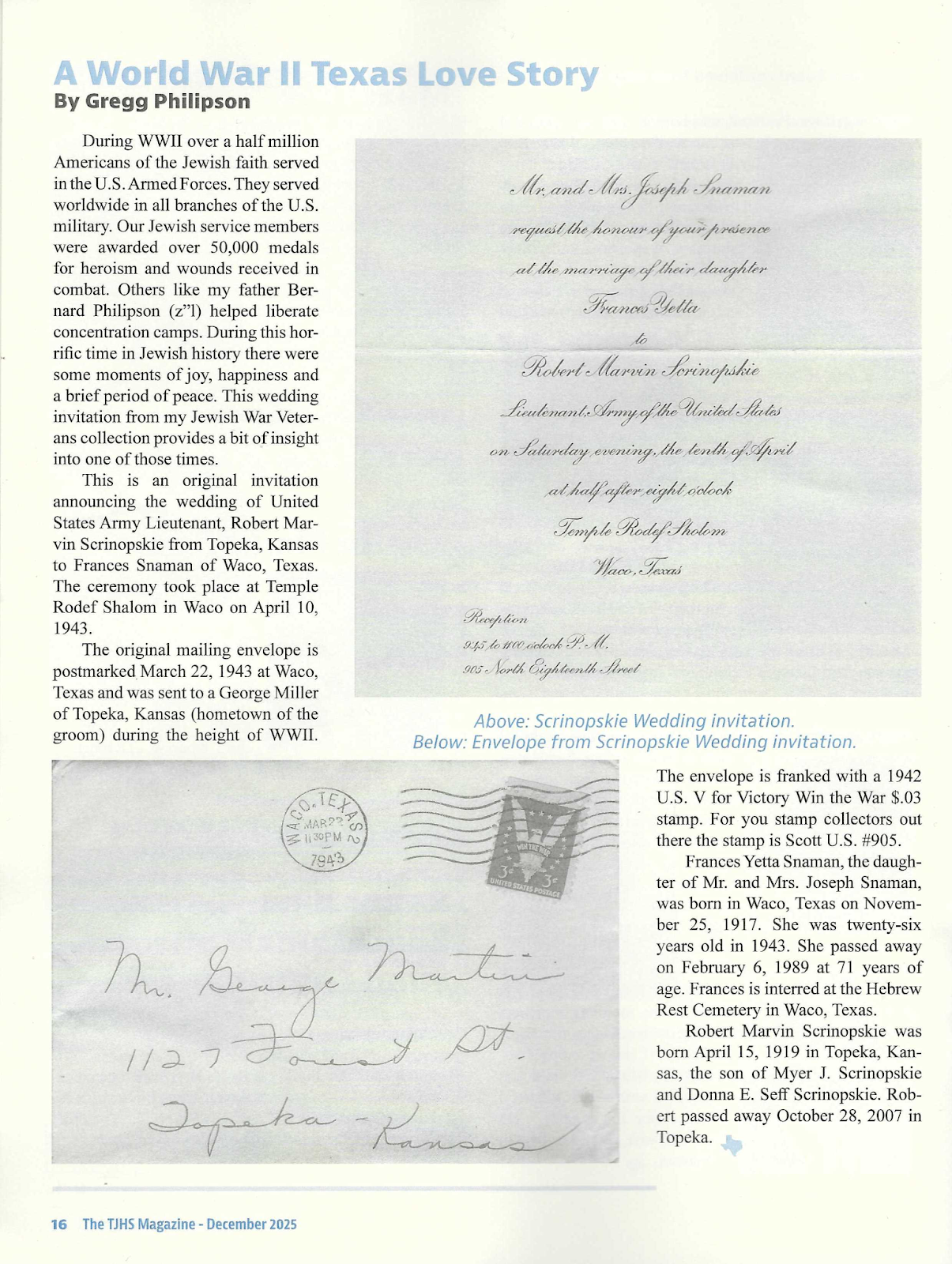 I wasn’t born in Texas, but I’ve lived and worked here long enough to identify as a Texan. As such, I have a particular affinity for stories that connect Jewish culture and my adopted home state. This wedding invitation, part of my Jewish War Veterans Collection, tells one such story, and it was my honor to share it with the Texas Jewish Historical Society for distribution in their December 2025 newsletter.