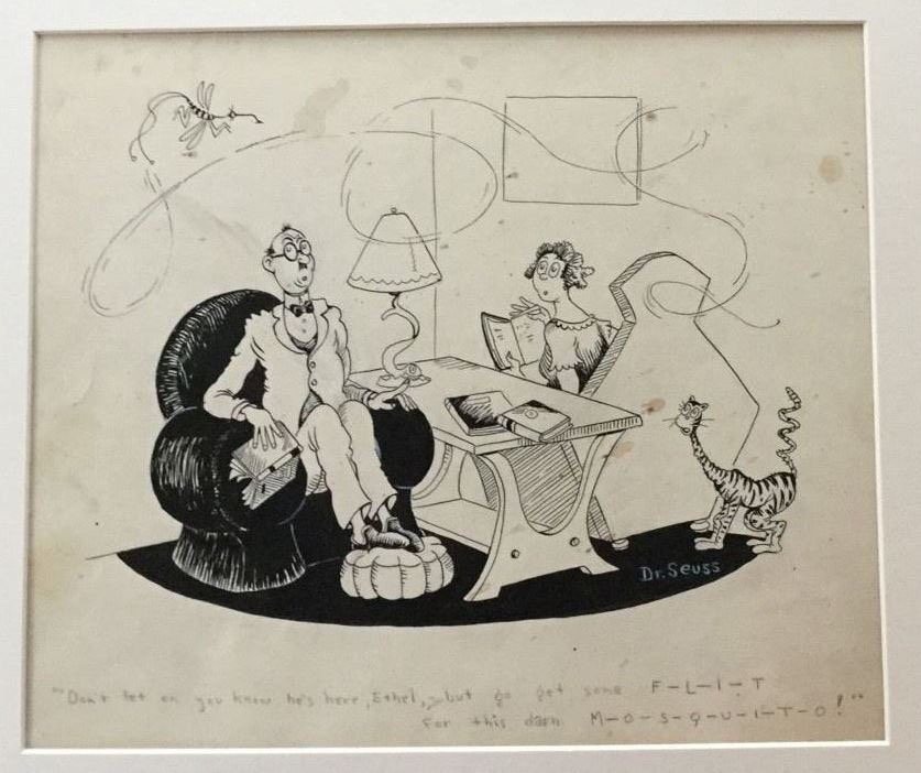 Dr. Seuss was hired by Standard Oil in 1928, at twenty-four years old, to promote Flit insect repellent, and he spent seventeen years drawing advertisements in which characters of all kinds shouted the catchphrase, “Quick, Henry, the Flit!” as they battled insects both literal and metaphorical.