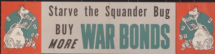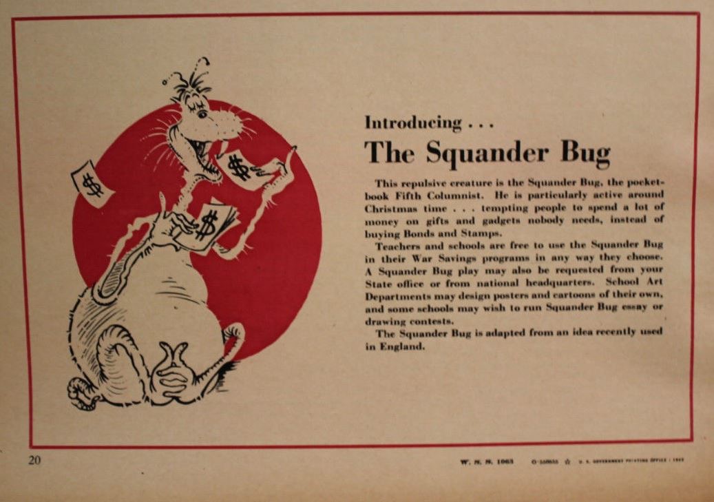 When he wasn’t drawing for PM, Seuss was creating propaganda for the US Treasury Department and War Production Board. One of his most notable campaigns was “the Squander Bug,” which urged citizens to curb their excess spending and reroute that money to war bonds.