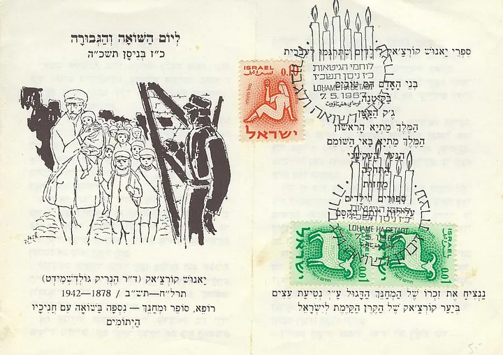 A card from a 1967 Holocaust remembrance rally in Israel, featuring Korczak and his children.