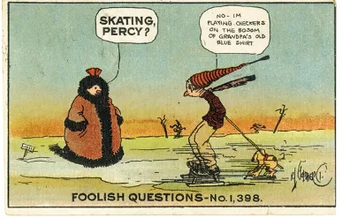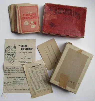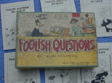 Perhaps Goldberg’s best-known series, behind the inventions, is his “Foolish Questions.” His sketches of people asking obvious questions and getting ridiculous answers made their way to postcards, magazines, and even card games, providing “A million dollars worth of laughs for thirty-five cents,” as one game insert (pictured below) puts it.