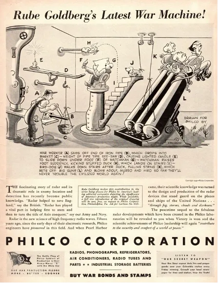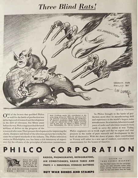 Below, you can see earlier political statements in two advertisements he drew for the Philco Corporation: “Rube Goldberg’s Latest WarMachine” features Hitler, Mussolini, and Hideki Tojo being shot out of a cannon, and “Three Blind Rats” positions the same fascist leaders as rats.
