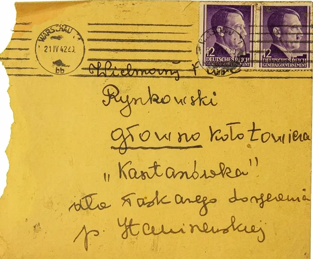 Postmarked April 21 at Warsaw, Poland, the cover is franked with two 1941 Mi-75 12 Groschen Deutsches Reich Generalgouvernement Nazi occupation stamps. The letter was authenticated by Holocaust experts and then translated by my friend Mieczyslaw. Mieczyslaw placed my bid successfully, and together we were the high bidders on this unique piece of Holocaust history.