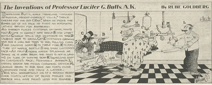 Most of Goldberg’s legacy is defined by his humor — most prevalently the complex machines he designed to do such simple tasks as brushing teeth or taking photos. Those machines were featured in a Sunday Funnies comic strip that ran from 1914 to 1964, in which Professor Lucifer Butts presents and explains his inventions.